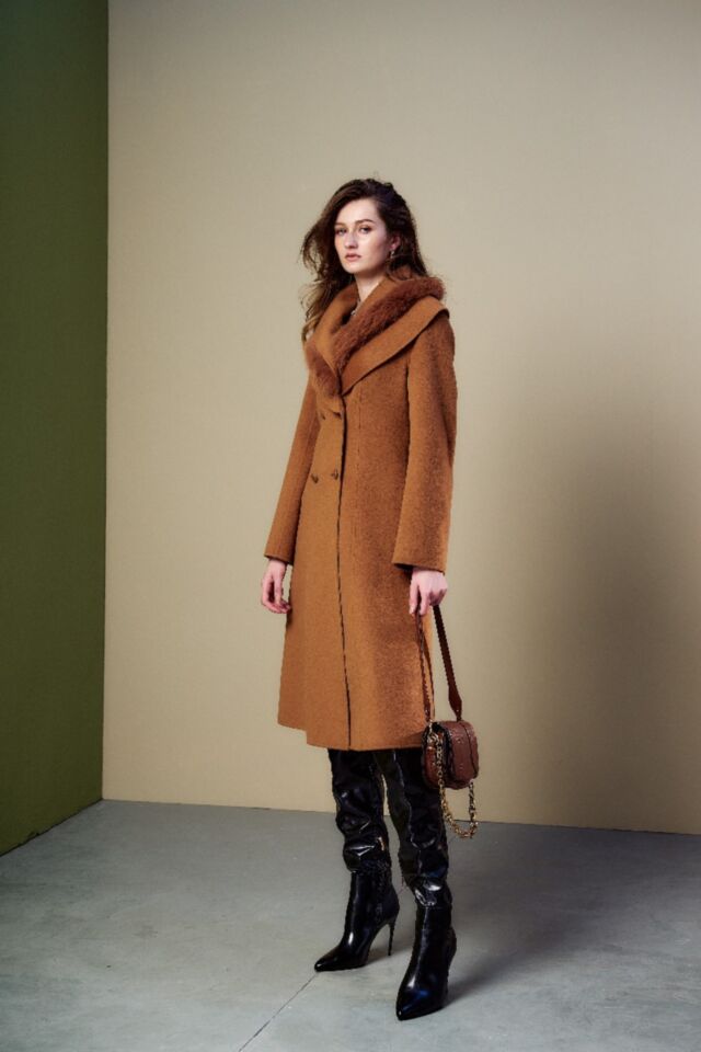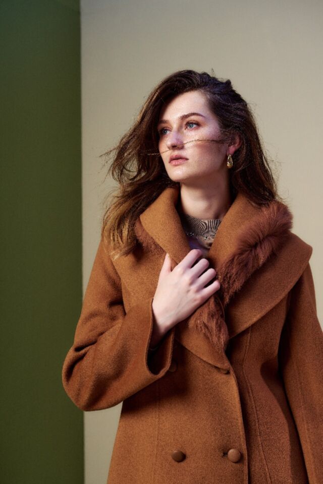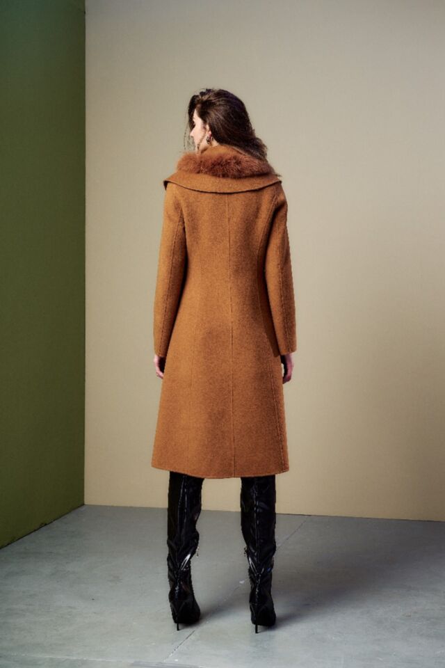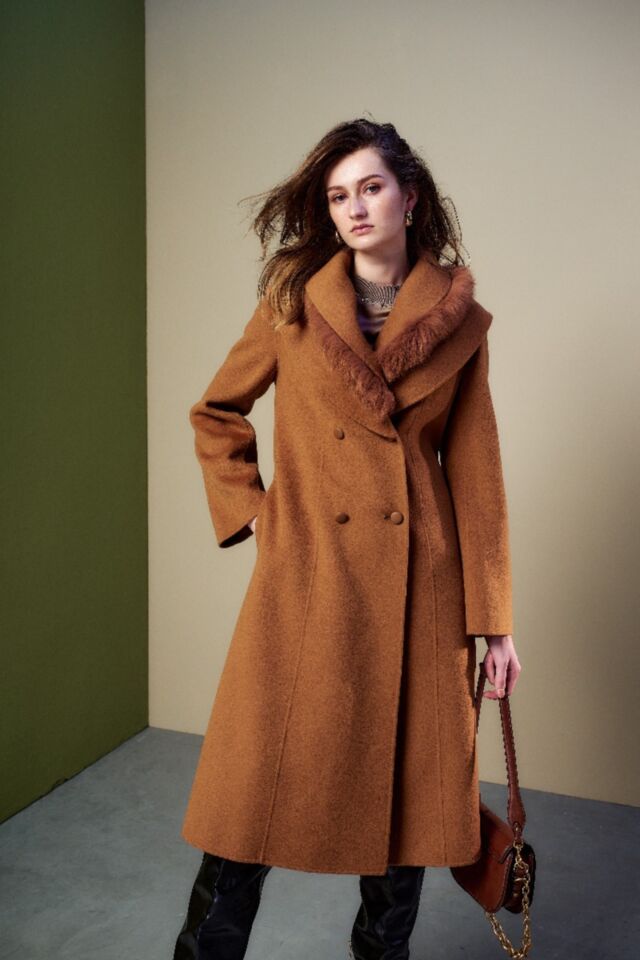 保暖重量輕盈的羊毛面料, 收腰雙排釦的廓型, 以圓潤的大翻領為設計, 加上可拆卸式的皮草領, 奢華有層次感