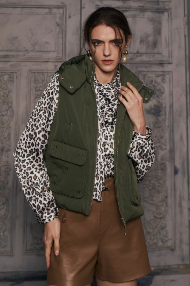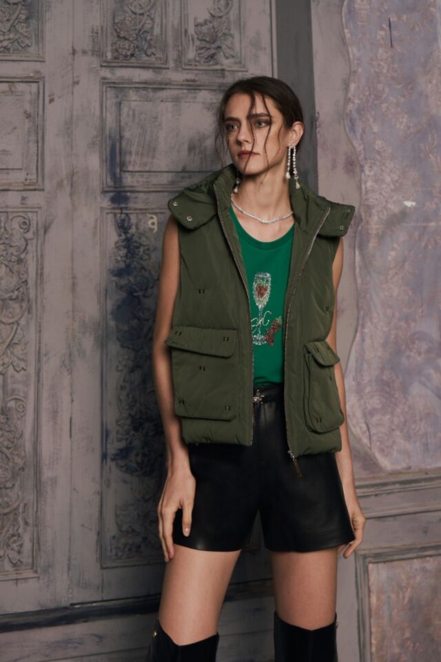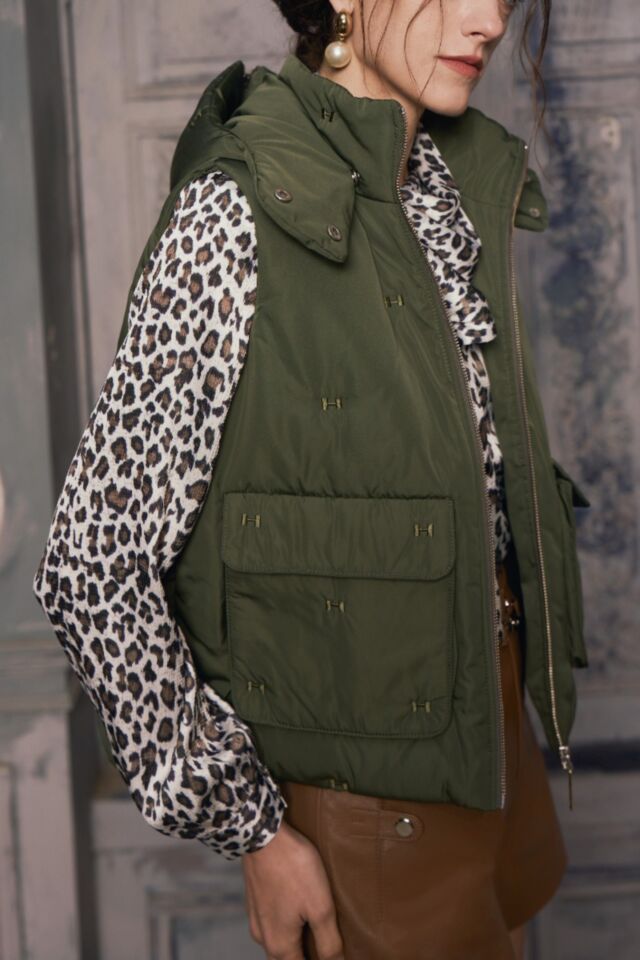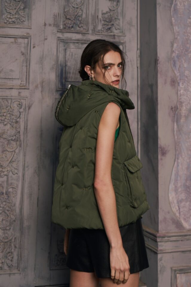 以品牌LOGO的H刺繡為設計, 以金屬和拉鍊細節點綴, 為連帽鋪棉背心展現實穿率性的風格