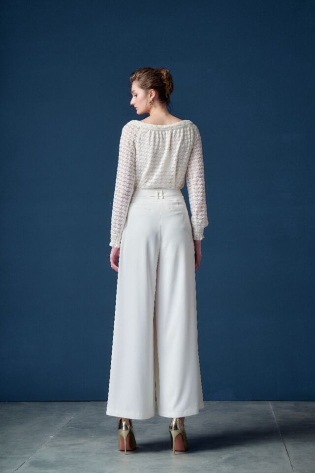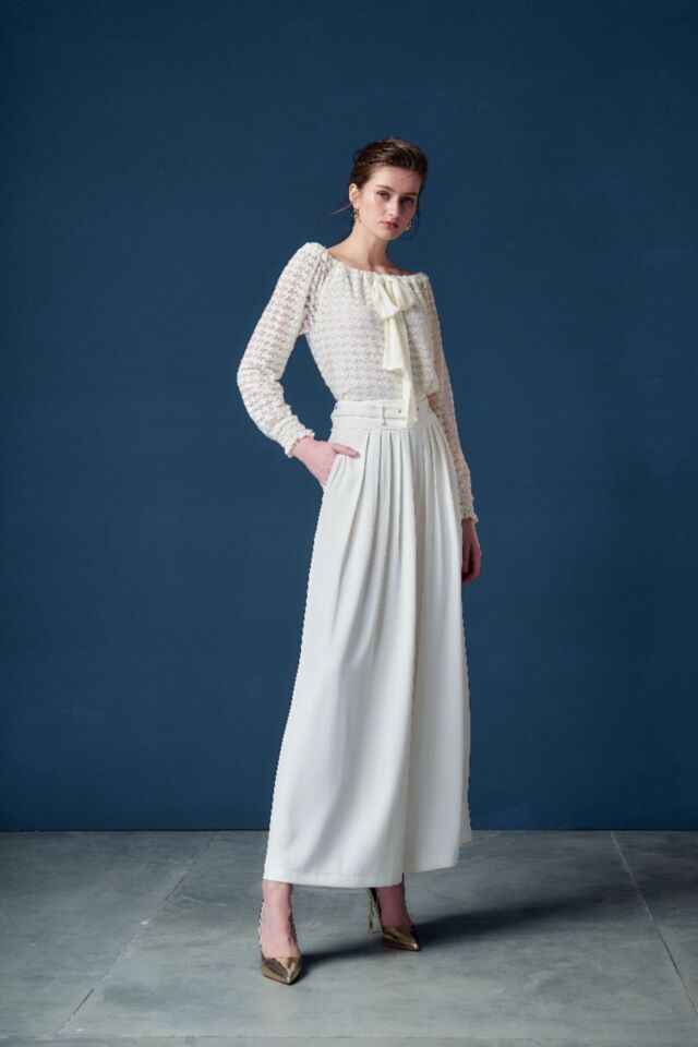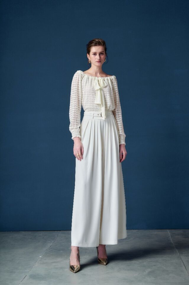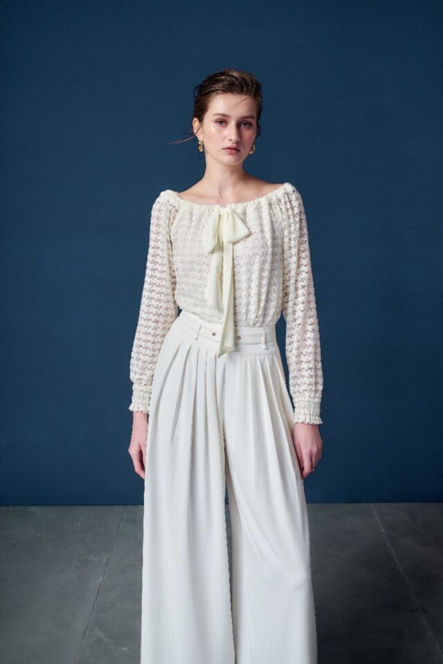 立體針織面料呈現鏤空紋路和毛羽感, 優雅的綁帶一字領, 浪漫鬆弛
