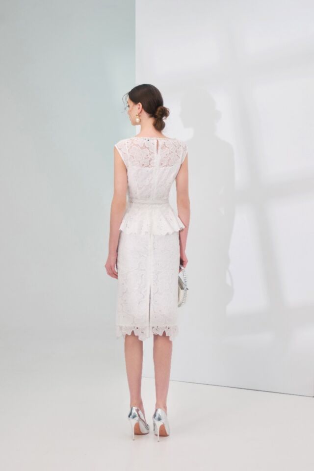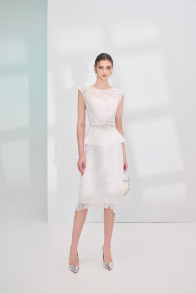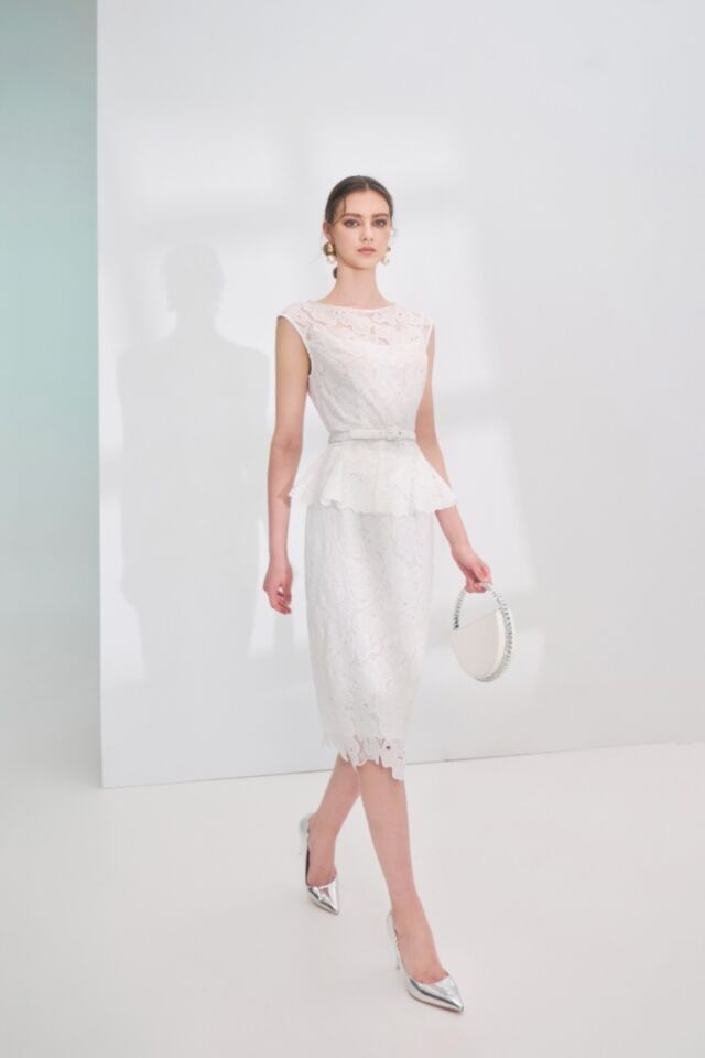 • 直筒中長裙裙襬保留蕾絲不規則的型態, 俐落百搭