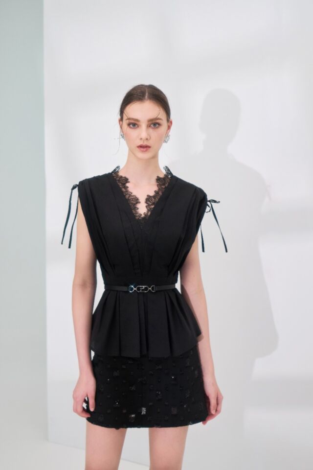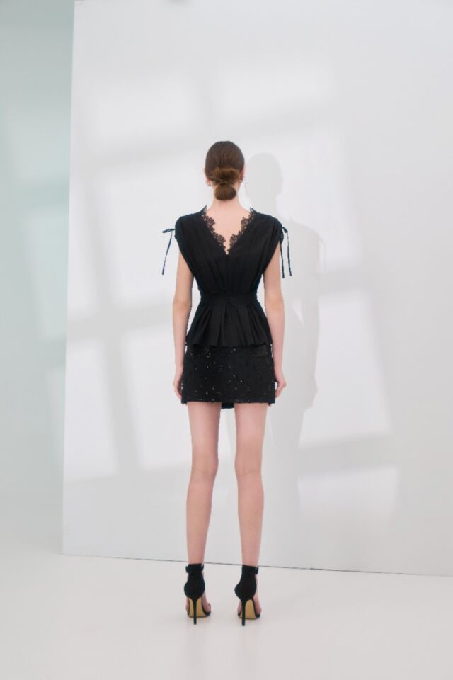 大小不一的亮片方格組合成的幾何牛仔面料, 保留方格的些微透膚感, 褲裙設計更舒適時髦