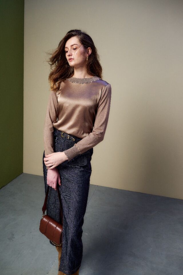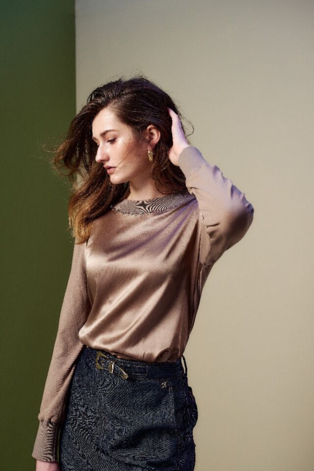 緞面拼接T恤羅紋, 以珠飾在領口和袖口點綴, 玩轉休閒與正式的邊界