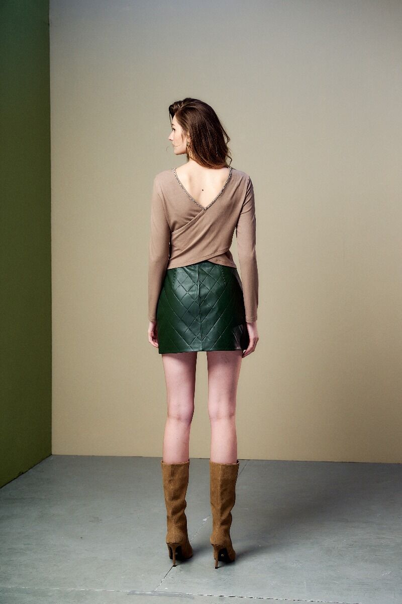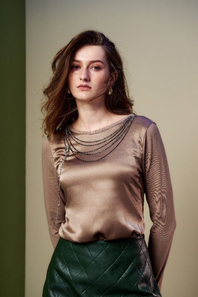 緞面拼接T恤面料, 以領口垂盪的鑽鍊點綴, 時髦又百搭