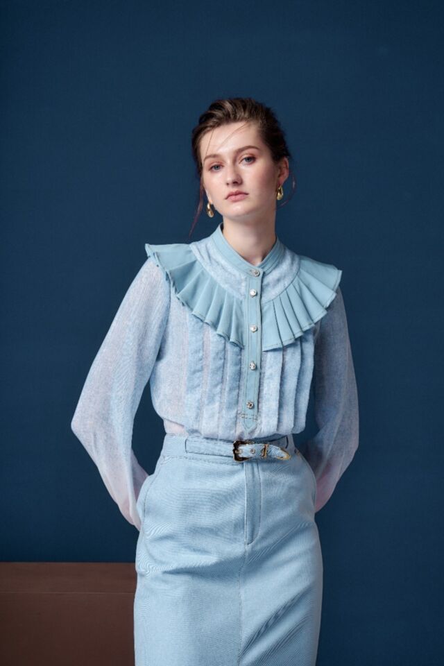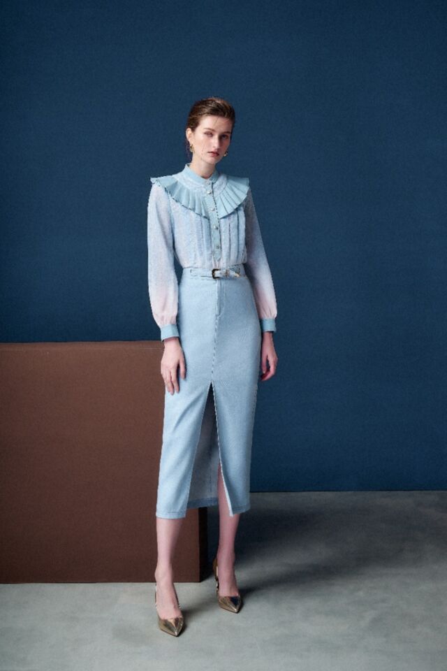 舒適厚實的丹寧面料, 以打褶工藝呈現, 結合漸層牛仔印花的襯衫廓型, 簡約又有型