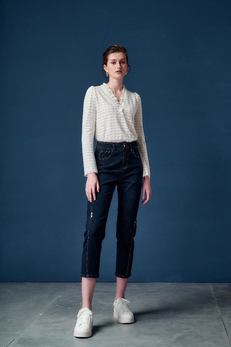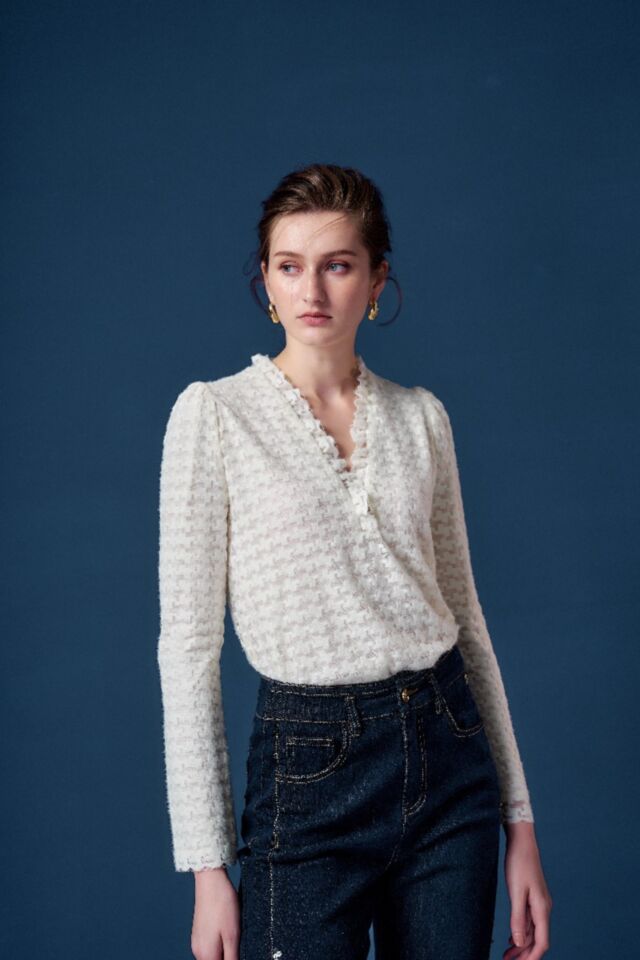 立體針織面料呈現鏤空紋路和毛羽感, 花邊V領搭配剛好的鬆度, 舒適百搭