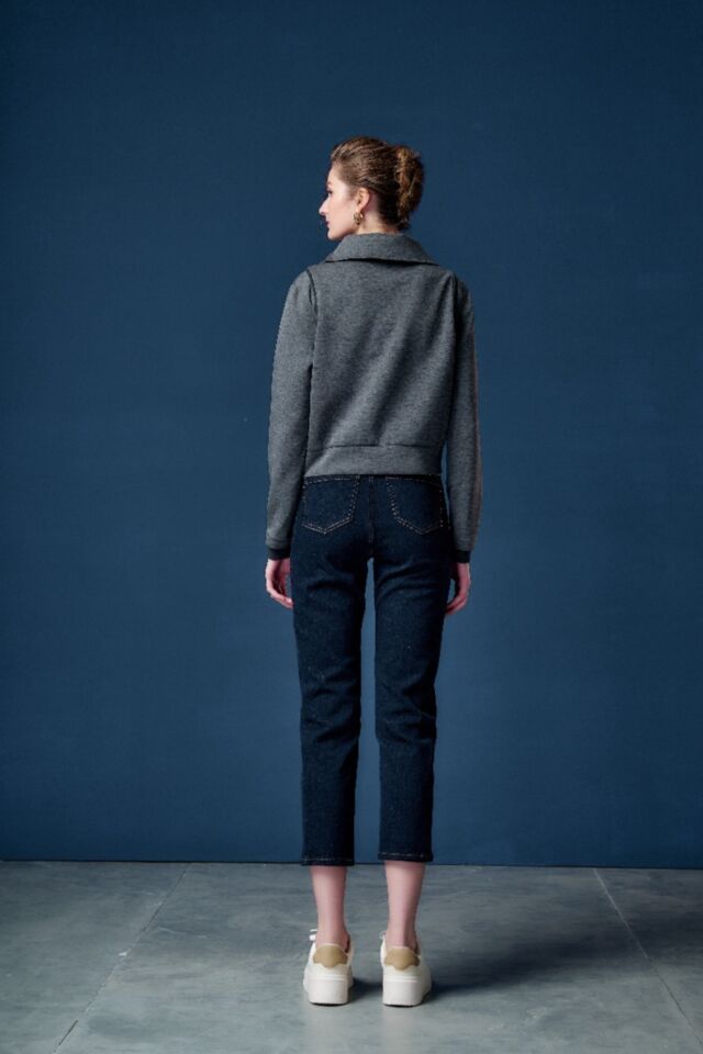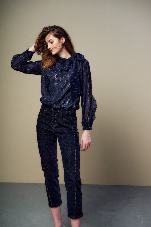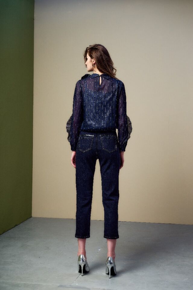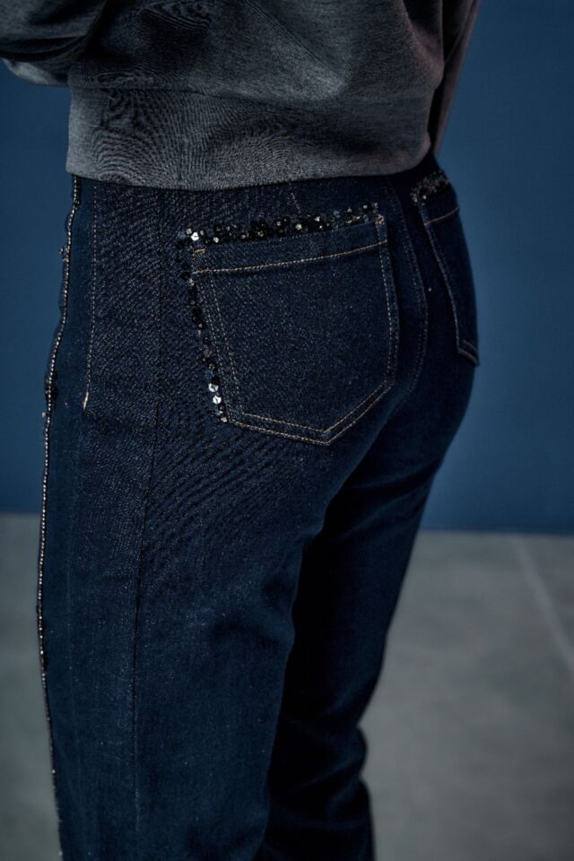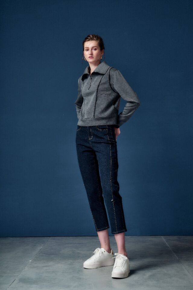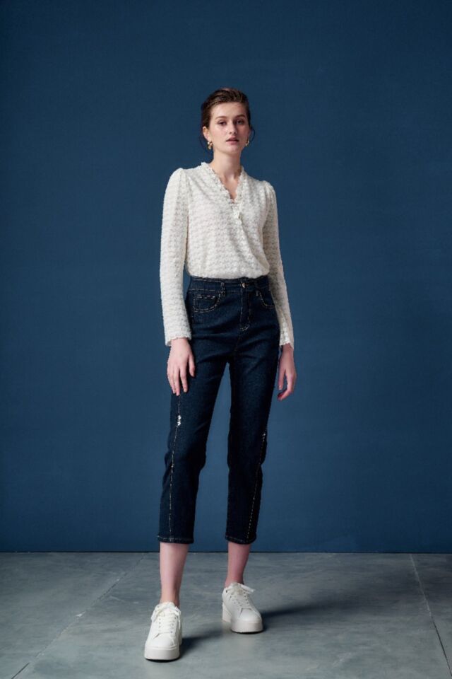 九分直筒褲的俐落版型, 剪接線以鑽飾點上衍生而下, 簡約有線條層次感