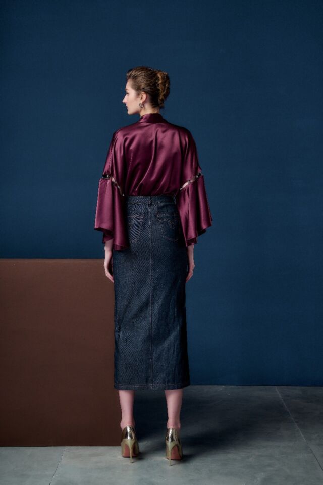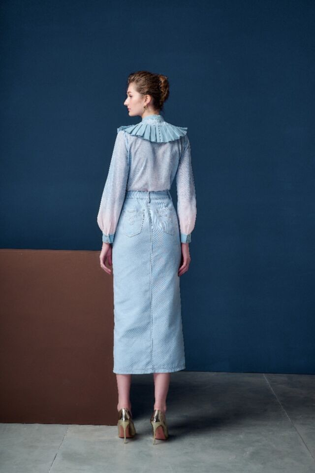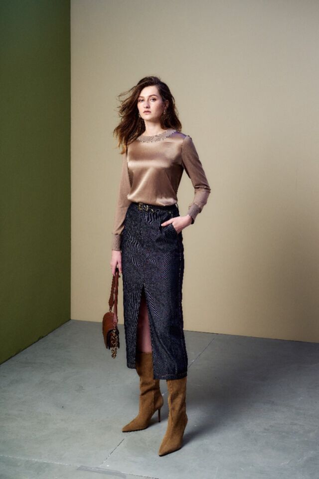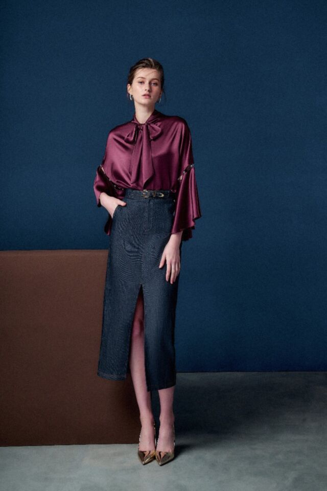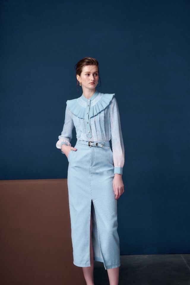 舒適厚實的丹寧面料, 直筒長裙的的俐落廓型, 金屬腰帶釦更為單品點睛, 率性更時髦