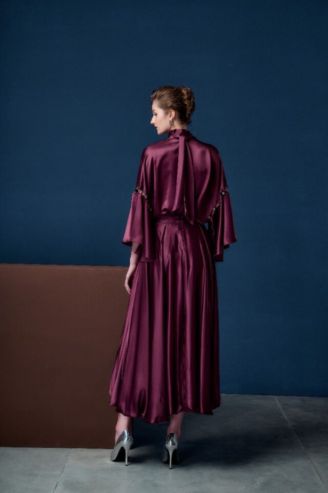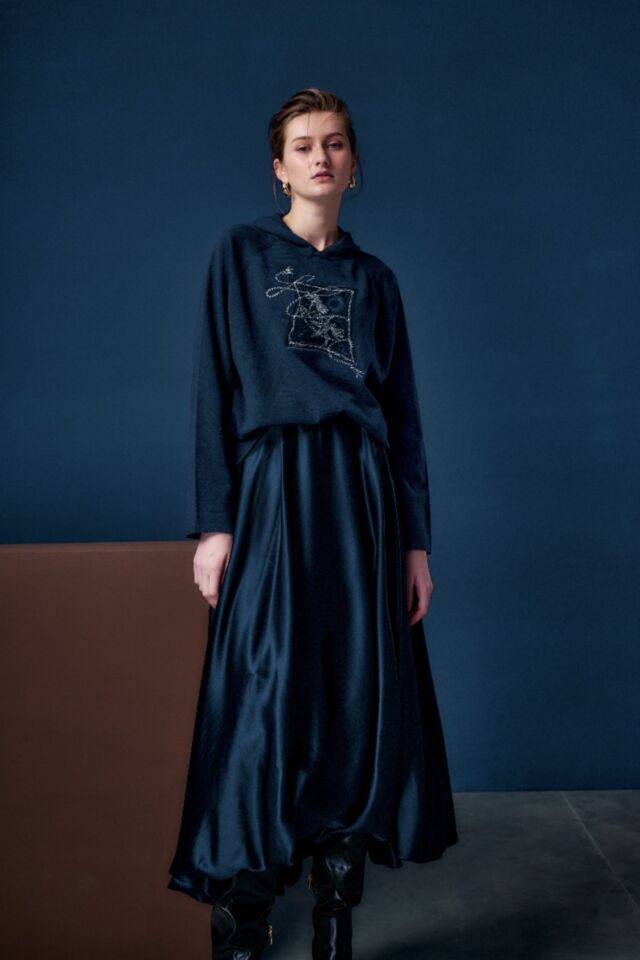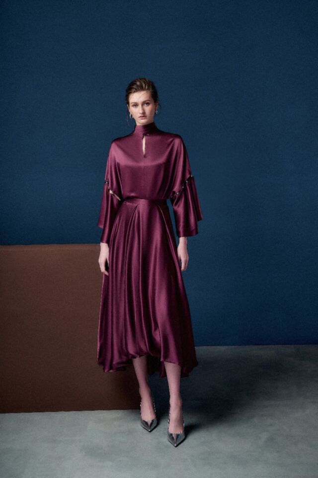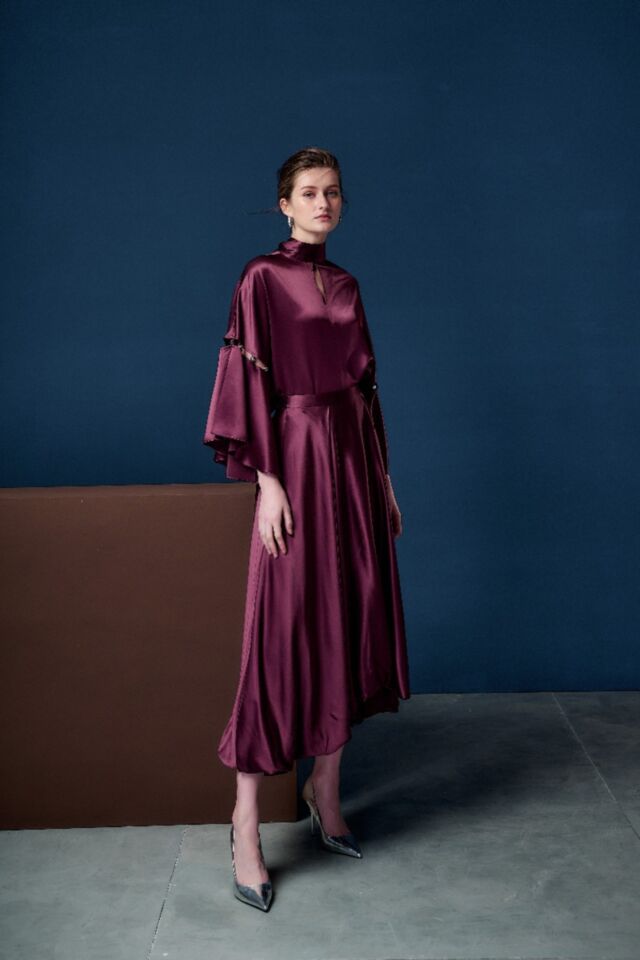 醋酸面料的低調光澤, 泡泡裙的縐褶份量, 流線前短後長的廓型, 靈動百搭