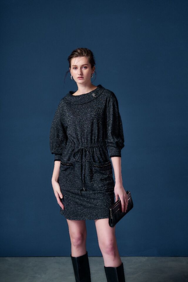 反褶的圓潤立領, 抽繩的收腰效果, 搭配 LOGO鑽飾胸針, 造就鬆弛得體的舒適穿搭
