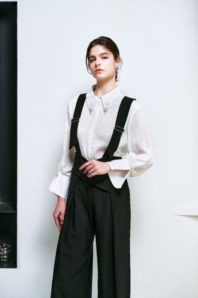 精緻的珠飾的漸層效果在領片上散開, 與袖口釦子相呼應, 細緻百搭