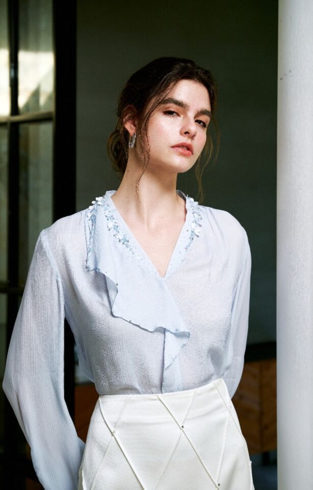 深V領口以荷葉和晶瑩瑩剔透的亮片和珠飾點綴, 精緻百搭