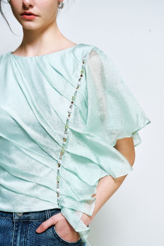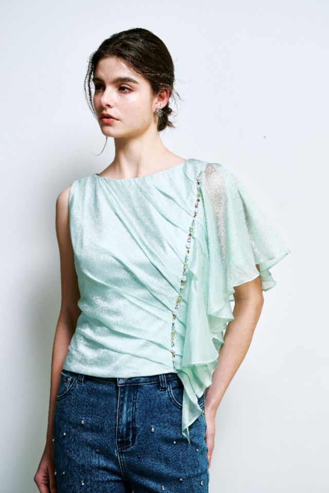 透感的光澤面料, 單肩細膩的打褶版型, 打造立體層次, 側邊以珍珠珠飾點綴, 增添溫潤的珠寶光采