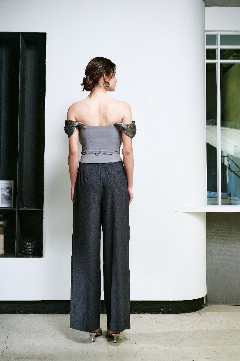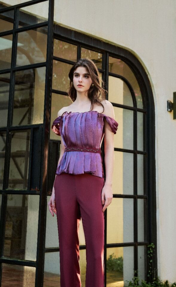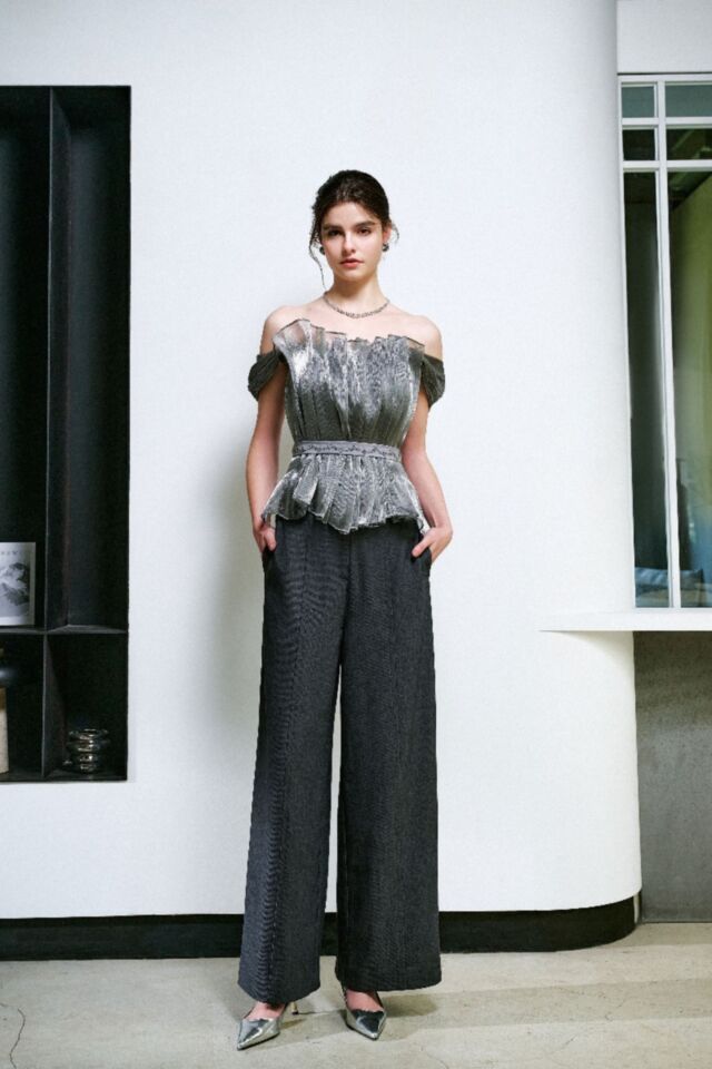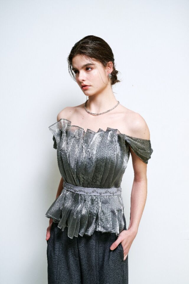 金屬光澤的波光粼粼, 立體剪裁展現華麗線條, 腰間以鑽飾點綴拼接, 勾勒極致身型
