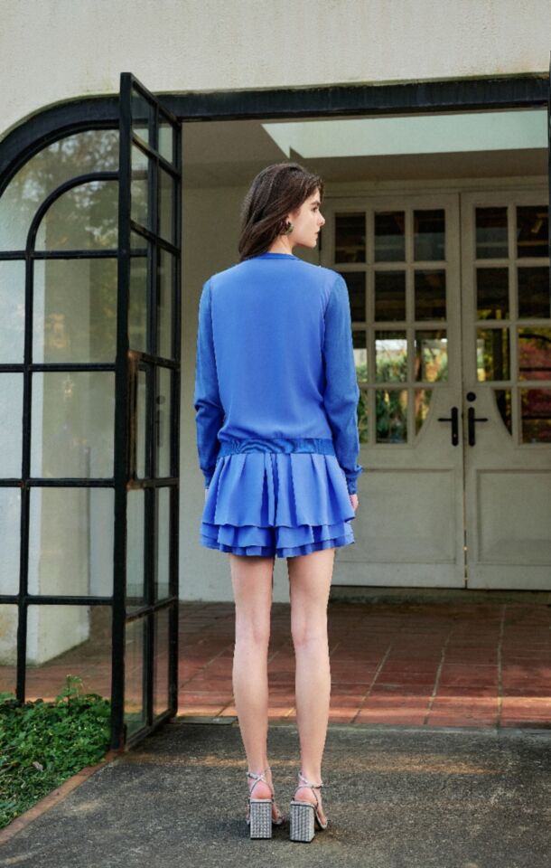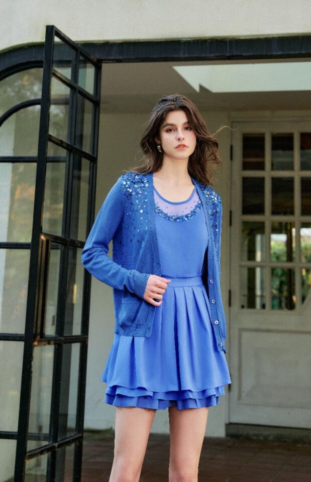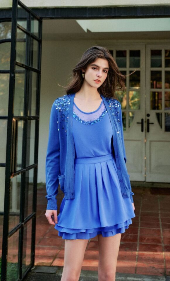 粼粼波光的亮片, 漸層式的分佈設計隨步伐躍動, 搭配經典V領開襟剪裁, 襯托出精緻的層次感與華麗氣場