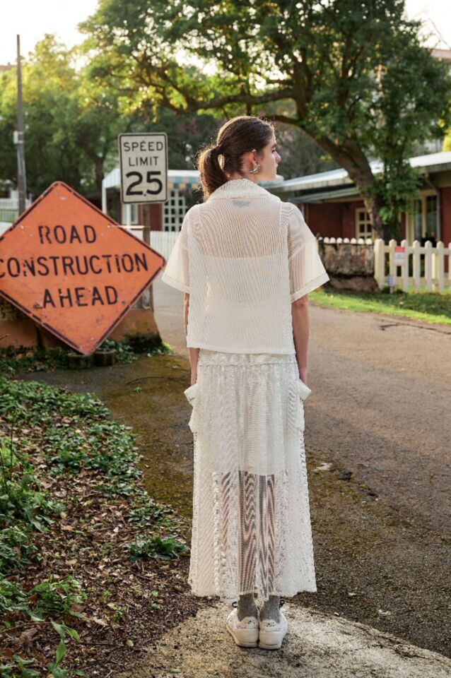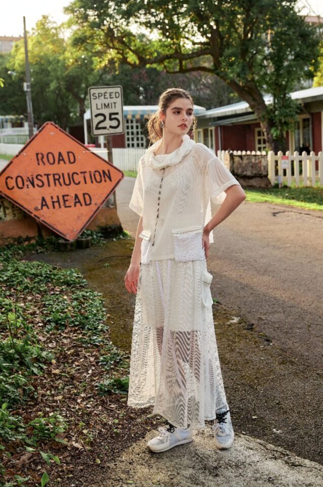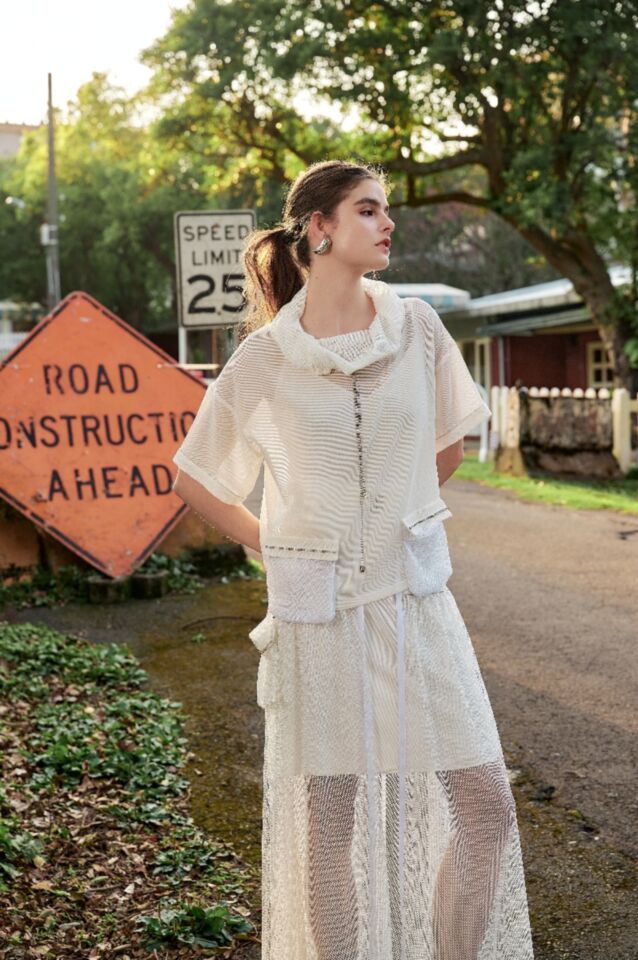 輕透的網格布面, 寬鬆的堆堆領剪裁展現休閒感, 以金屬鍊為抽繩, 精緻更率性