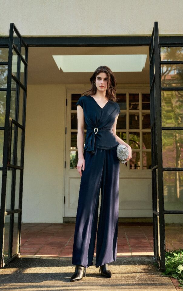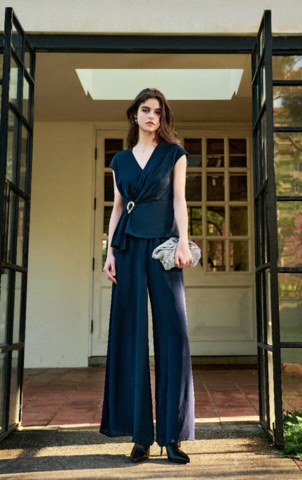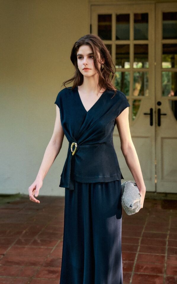 V領裹身廓型, 以金屬飾釦點綴, 抓褶散開的剛剛好, 洗鍊優雅