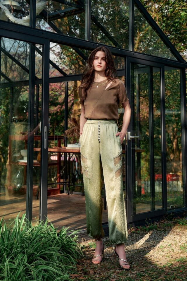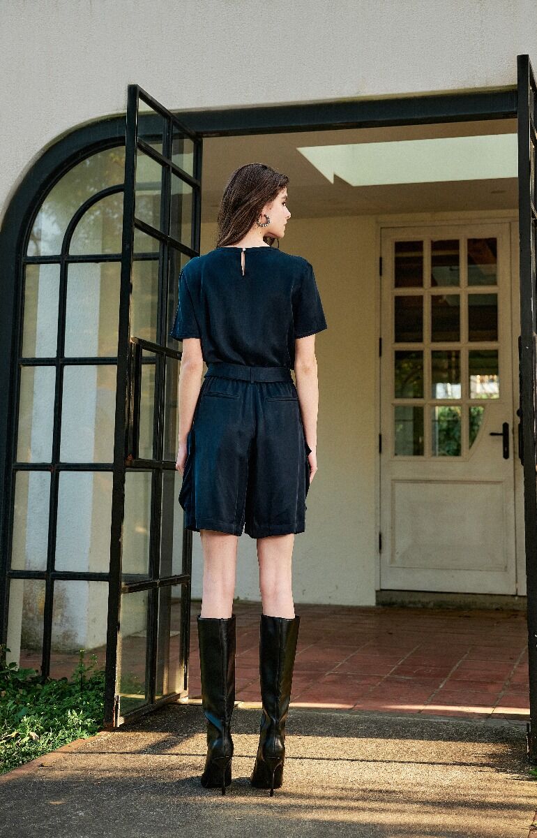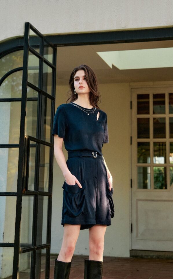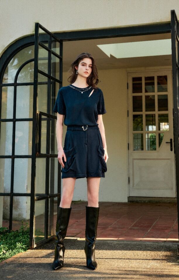 不對稱的斜切鏤空設計, 俐落的短袖圓領版型, 以金屬鏈與墜飾點綴, 舒適率性