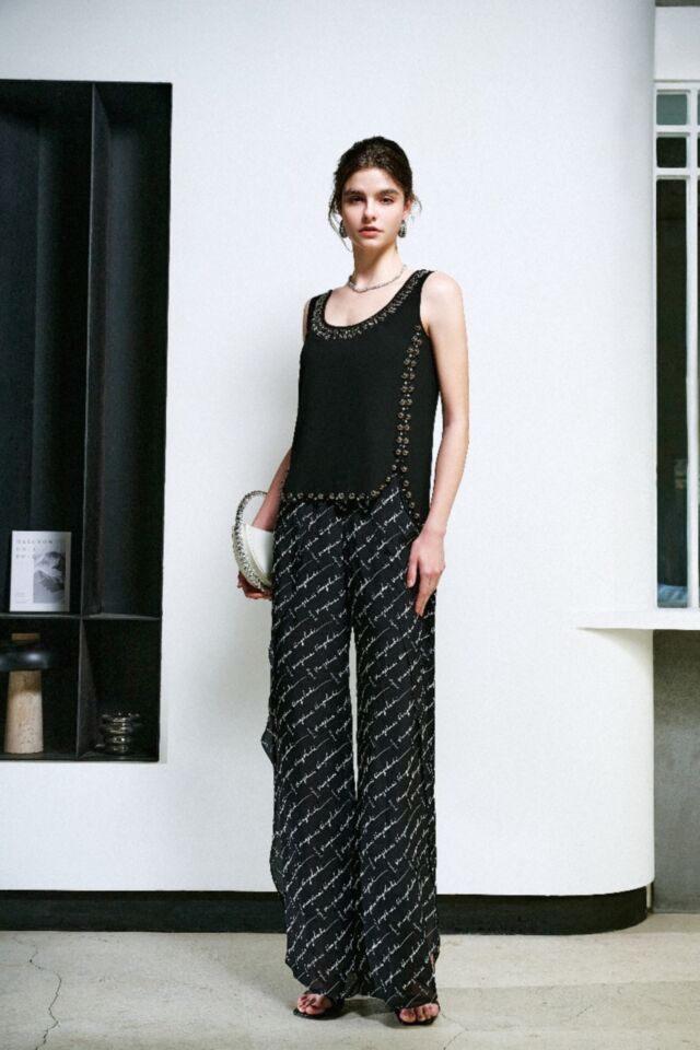 圓弧線條的大領口背心版型, 以多種珠鑽飾點綴呈現, 俐落率性