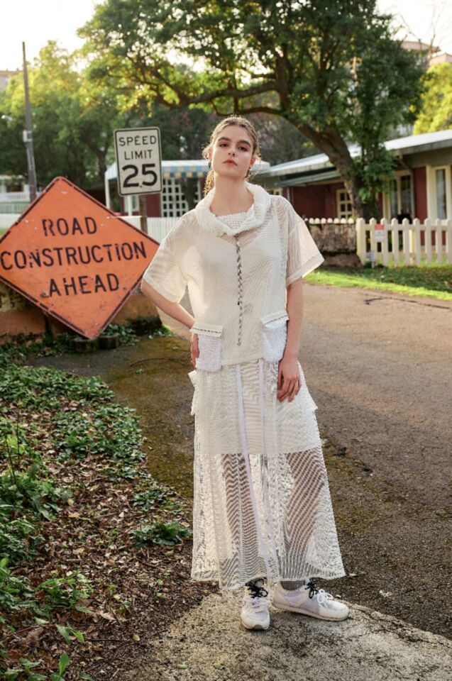 輕透的網格布面, 拼接絲滑緞面中裙,金屬釦腰帶搭配兩側立體口袋, 營造率性的層次感