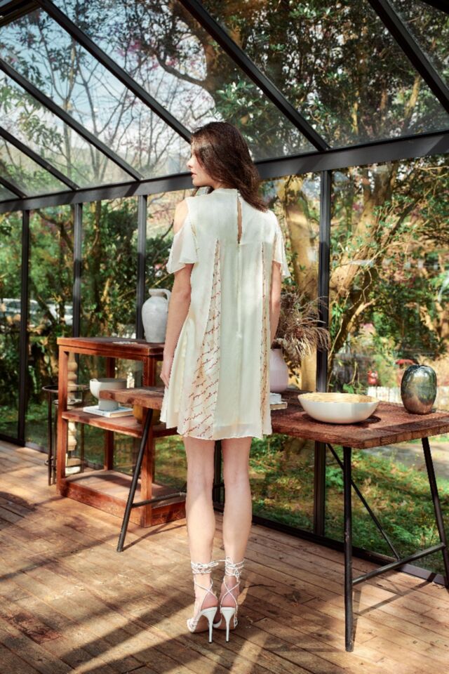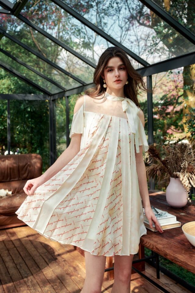 壓褶拼接工藝, 印花與素面布交疊, 在輕盈律動間若隱若現的印花, 綁帶和飄袖更添柔美優雅