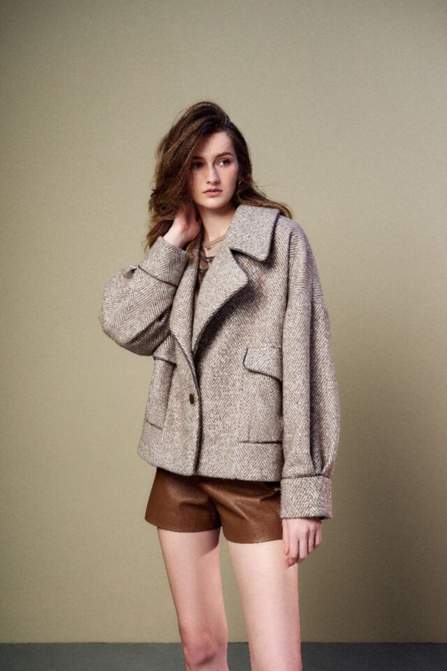 V型線條的毛呢面料, 以翻領和翻蓋口袋版型呈現, 緞面邊條在剪接線處點綴, 慵懶百搭
