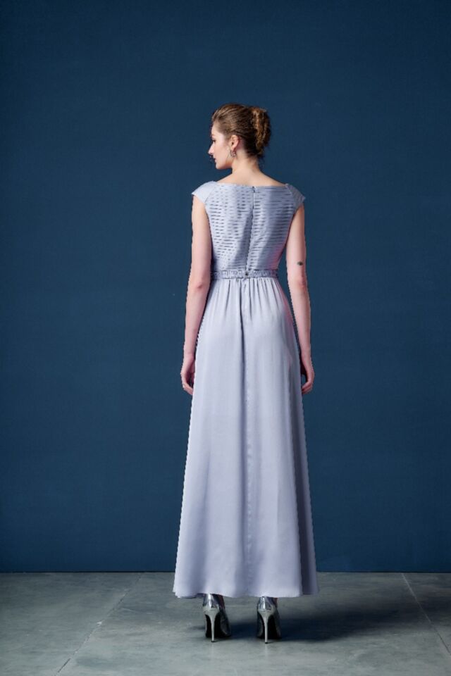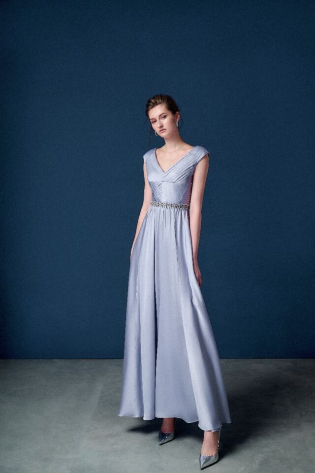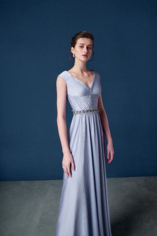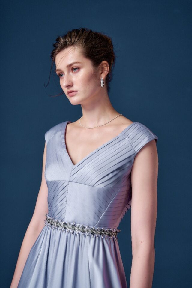 多道手工打褶工藝, 打造立體線條交錯的效果,腰間編織珠飾呼應以飄逸的裙擺延伸出去, 浪漫細緻